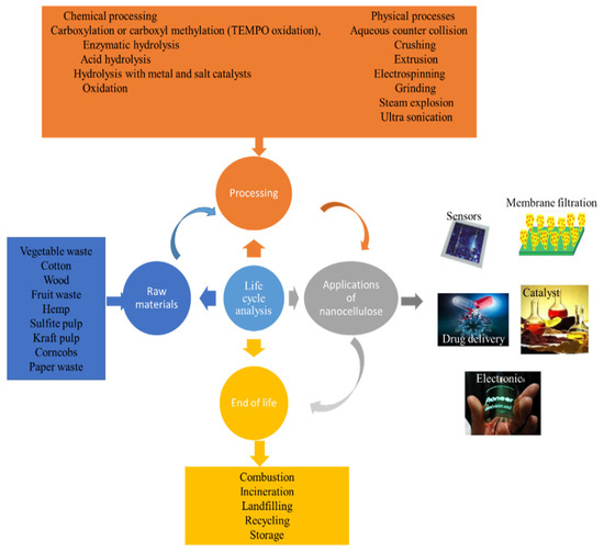 Life cycle analysis of nanocellulose from different waste materials, from the cradle to the grave (modified from Faroughi et al. [151]).