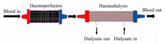 The combination of diffusion, UF, and adsorption using HD and haemoperfusion techniques could offer many advantages. Firstly, the fouling or blocking of pores in membrane surfaces can be avoided [40]. Secondly, middle molecules and protein-bound uremic toxins would be first adsorbed in the haemoperfusion system, leaving only small water-soluble molecules in the blood to be removed by dialysis (diffusion) through HD membrane. Under these arguments, it can be assumed and predicted that the combination of HD and haemoperfusion techniques promotes excellent uremic toxin clearance [36].