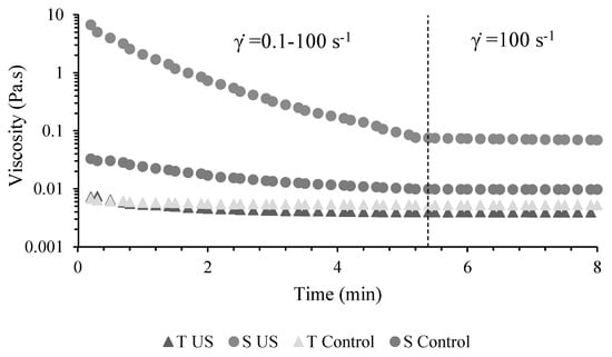 In the second part of the test, when maintaining shear rate values constant, a time-independent pseudoplastic behavior could be observed for all four samples. The average viscosity value of ultrasonicated S nanoemulsion (S US) in the constant shear rate domain was significantly higher from the other three samples (p < 0.05), while the S Control sample registered similar viscosity to both T samples (T US and T Control) containing nanoemulsions (Table S1).