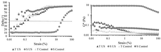 Viscoelastic characteristics of obtained nanoemulsions in terms of phase shift (δ°) and G* evolution as a function of applied strain are presented in Figure 2 on a semi-logarithmic scale. Phase shift δ is a measure of the sample’s viscoelasticity. For a viscoelastic solid-like behavior, delta values <45° are registered, while values >45° will be characteristic of viscous liquid-like structures [32]. The onset of flow corresponding to the G′-G″ intersection is registered at 45°, while 90° is characteristic of Newtonian behavior. G* is a measure of the deformation of the sample and embraces both elastic (G′) and viscous moduli (G″). The results presented in Figure 2 show that only S US nanoemulsions presented an LVR—the structure being resistant to the applied strain up to a value of 10%. At this point, particles start moving, however, the flow was not yet initiated up to a strain of 25% (Table S1). Additionally, S US nanoemulsions presented the highest consistency (G* values) in comparison to the other three samples (p < 0.05). T samples registered a very weak liquid-like structure with no significant effect resulting after sonication (p > 0.05). Similar viscous behavior for the entire strain domain tested (Table S1) was registered for S nanoemulsion with no sonication (S Control).