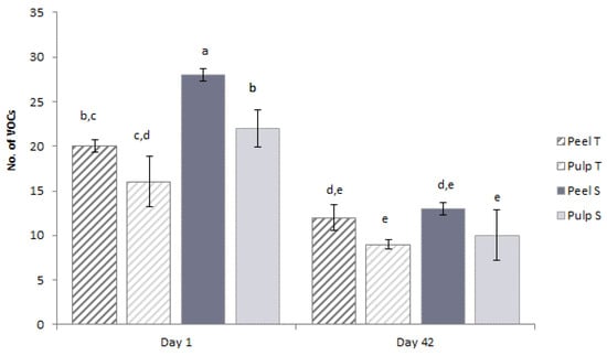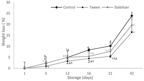 Weight loss of zucchinis during 42 days of storage. The data are mean ± SD of three replicates from two zucchinis. Different letters indicate significant differences with ANOVA and Tuckey post-hoc test at p < 0.05.