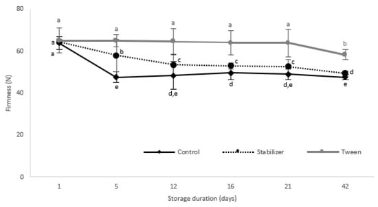 Zucchinis’ firmness was evaluated at each storage time with Fruit Texture Analyzer (GȔSS, Hamburg, Germany) by measuring the maximum penetration force, Fmax (N), required for an 8 mm diameter probe to puncture the peel of a coated zucchini sample of 20 × 20 × 20 mm to a depth of 20 mm, at the equatorial part of each sample [27,28]. The test speed was set at 15 mm/s and measured speed at 10 mm/s. All texture measurements were performed in triplicate.