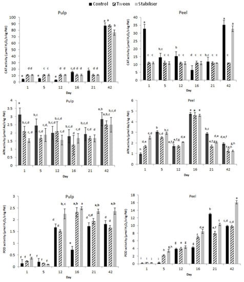 Each day when analyses were scheduled, zucchini samples, coated and uncoated, were peeled with a sharp knife, and further, 10 g of the plant (pulp or peel) were grated. The mash was immediately transferred in 25 mL 0.2 M phosphate buffer pH 6.6 and stored for 45 min in the dark at 4 °C for extraction. Then, the mixture was centrifuged (6000× g) at 4 °C. Next, the supernatant was further used as crude enzyme extract for enzymes activity determination. The enzymes activity was determined with a spectrophotometer (UV VIS Cintra 202, Braeside, Australia). All experiments were conducted in triplicate. All the reagents used in the extraction and measurement were of analytic grade or a high degree of purity.