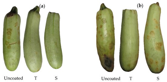 Zucchinis S coated had the same weight loss as the uncoated ones during the first 12 days of storage. The weight loss was significantly low (p < 0.05) and prevented by S coating during the last 26 days of storage, leading to 85% lower weight loss compared to the control in the 42 days of storage. T triggered the smallest weight loss of all analyzed samples during the entire storage period, leading to 66% weight loss compared to uncoated zucchinis, after 42 days of storage. These results indicate that T coating had the best performance in zucchini during the entire 42 days of storage.