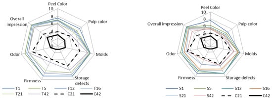 Influence of the coating on zucchini sensory evaluation after 42 days of storage. T1, T5, T12, T16, T21, and T42 represent the average score for each individual sensory attribute obtained by the coated zucchini with Tween 20 stabilizer in the 1st, 5th, 12th, 16th, and 42nd day of storage, respectively; S1, S5, S12, S16, S21, S42 represent the average score for each individual sensory attribute obtained by the coated zucchini with gums mixture as a stabilizer in the 1st, 5th, 12, 16th, and 42nd day of storage, respectively; C21 and C42 represent the average score for each individual sensory attribute obtained for uncoated zucchini (control) in the 21st and 42nd day, respectively.