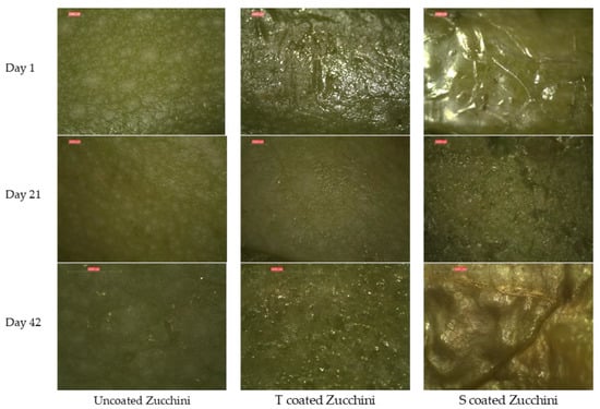 Evaluation of the zucchinis’ coated surface during the 42 days of storage was performed with Leica EY4D (Leica, Wetzlar, Germany) stereomicroscope.