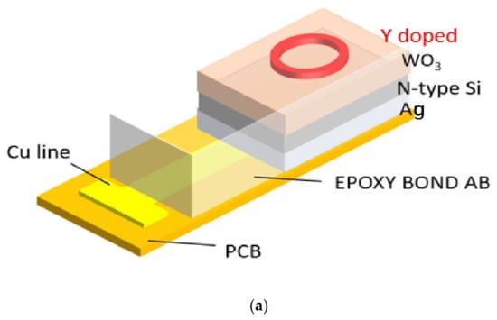 The following are the fabrication processes of the EIS sensor with the WO3 sensing film and Y-doped WO3 sensing film. The WO3 sensing membrane is deposited on silicon substrate by RF sputtering with RF power of 100 W. The chamber pressure is 10 mTorr and the deposition gas ratio is Ar:O2 = 20:5. The deposition thickness of WO3 is 60 nm. The Y-doped WO3 sensing membrane is co-sputtered on silicon substrate by RF Sputter with WO3 target and Y target, in which the two RF powers are 100 and 120 W, respectively. The deposited pressure is 10 mTorr, the deposition gas ratio is Ar:O2 = 20:5, and the deposition thickness is 65 nm. The WO3 sensing film and the Y-doped WO3 sensing film are given RTA treatment. The annealing temperatures are 400, 500, and 600 °C, respectively; the annealing time is 30 s in an oxygen environment. Then, adhesive silicone gel is used to define the sensing window and, conductive silver glue (Ag) is then used to fix it onto a PCB board. Finally, AB glue is used for packaging to prevent oxidation. The detailed EIS structure of the Y-doped WO3 sensing membrane is illustrated in Figure 1a. The device under operation is shown in Figure 1b.