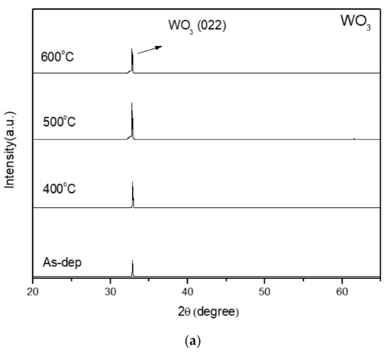 Figure 2a,b shows the XRD analysis of the WO3 sensing membrane and the Y-doped WO3 sensing film without annealing and annealing at 400, 500, and 600 °C, respectively. The two types of samples have the same diffraction peak (022), which can be observed at the 2-Theta value of 32.9, and the peak is attributed to monoclinic WO3 (022). In the Y-doped WO3 sensing film, there are two diffraction peaks (022) and (543) [25,26], which can be observed at the 2-Theta value of 32.9 and 61.6. The peak at the 2-Theta value of 61.6 is attributed to Y2O3 (543). After annealing, the peak of WO3 (022) increases appreciably. Of the samples, the one with annealing at 400 °C has the strongest peak intensity, and the peak of Y2O3 (543) shows better crystallization. The XRD comparison of the WO3 sensing membrane and the Y-doped WO3 sensing membrane shows that the peak of WO3 (022) is stronger after doping.
