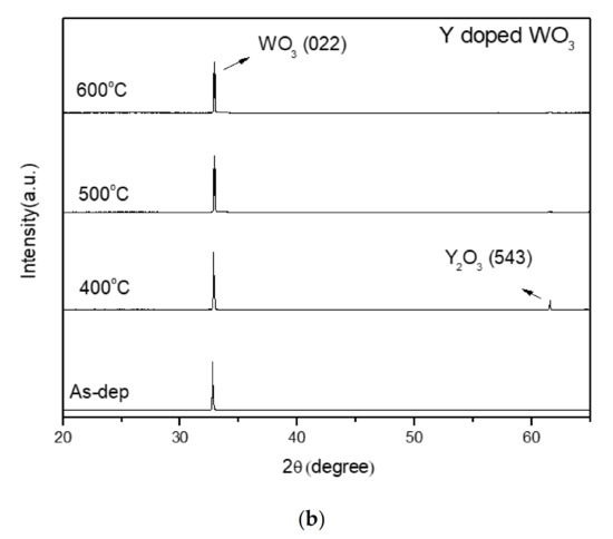 (a) XRD of the WO3 film after annealing at various temperatures in O2 ambient for 30 s. (b) XRD of the Y-doped WO3 film after annealing at different temperatures in O2 ambient for 30 s.