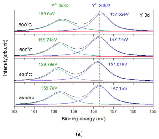 The Y 3D XPS spectra of Y-doped WO3 are shown in Figure 3a. There are two peaks located at the binding energy values of 157.7 [27] and 159.7 eV [28] for Y3+ in the case of as-dep, respectively. It can be observed that the binding energy is higher than the standard binding energy located at the values of 156.6 and 157.4 eV. The higher binding energy means the Y ions have been doped in the WO3 sensing film. Based on the literature [29,30,31,32], Y–O bonds are stronger than W–O bonds.