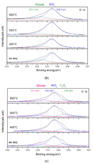 (a) The Y 3D XPS spectra of Y-doped WO3 film annealed at different temperatures in O2 ambient for 30 s. (b) O 1s of WO3 film. (c) O 1s of Y-doped WO3, annealed at various temperatures in O2 ambient for 30 s.