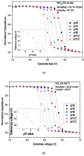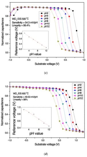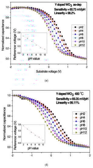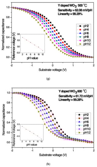 To measure the sensitivity and linearity of EIS capacitors, a Ketheley 2400 Source Meter is used to evaluate the C–V curves of the samples treated in various conditions. With 0.4 Cmax set as the reference capacitance, the sensitivity and linearity can be calculated by extracting the points of different pH values. All measurements are performed at room temperature. Figure 5a–h show C–V curves of WO3 and Y-doped WO3 sensing film annealed at different temperatures to evaluate the sensing performance. The sensitivity values of WO3 sensing film based on the EIS structure for the as-deposited, 400, 500, and 600 °C annealing are 45.15, 48.22, 54.3, and 49.53 mV/pH, respectively. The linearity values of the four samples for the as-deposited and the samples after annealing treatment are 97.3, 99.3, 99.4, and 98%, respectively. On the other hand, the sensitivity values of Y-doped WO3 sensing film based on EIS structure for the as-dep, the samples with 400, 500, and 600 °C annealing are 60.73, 69.35, 62.08, and 61.72 mV/pH, respectively. The linearity values of the four samples for as-deposited and post-annealing treatment are 98.2%, 99.11%, 99.29%, and 99.28%, respectively. The Y-doped WO3 sensing membrane showed better performance than the WO3 sensing membrane based on the above results. According to the physical analysis, it can be proved that the oxygen vacancy content obviously decreased in the Y-doped samples and the crystals formed. Therefore, the sensitivity and linearity are significantly improved. Compared with recent studies on pH sensing membranes, as shown in Table 1. Y doping and annealing can enhance effective electric field passing through WO3 dielectric and thereby improves the capacitance modulation as shown in Equation (1). Y-doped WO3 membranes with appropriate annealing have excellent sensing behaviors.