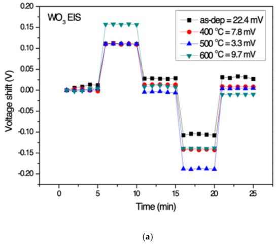 To observe how the acid-based solution affected the property of devices, the samples are soaked in solution in the order of pH7-pH4-pH7-pH10-pH7. The setup is shown in Figure 1b. The hysteresis is the voltage measured for every minute. The value of the hysteresis voltages reflects the defect density on the film and the defect, affecting the gate voltage in the sensing membrane [39]. The hysteresis voltage is defined as the substrate voltage difference between the initial and terminal voltages measured in the pH loop. All the measurements are performed at room temperature. The hysteresis voltage of the WO3 samples and Y-doped WO3 samples based on EIS structure in different RTA temperatures are shown in Figure 6a,b. The hysteresis voltages of the WO3 for the as-dep sample and the samples with annealing temperatures of 400, 500, and 600 °C are 22.4, 7.8, 3.3, and 9.7 mV, respectively. On the other hand, the hysteresis voltage of Y-doped WO3 for the as-dep sample and the samples with annealing temperatures of 400, 500, and 600 °C are 14.4, 1.7, 9.2, and 10.1 mV, respectively. The Y-doped WO3 sensing film annealed at 400 °C has the lowest hysteresis voltage. Furthermore, compared with the samples without Y doping, a significant decrease in hysteresis voltage can be observed after Y doping, for Y doping suppresses the defects and inhibits the formation of oxygen vacancies. Therefore, the function of membrane capacitance can be ameliorated as shown in Equations (1)–(3). The results are consistent with XPS analysis and XRD patterns.
