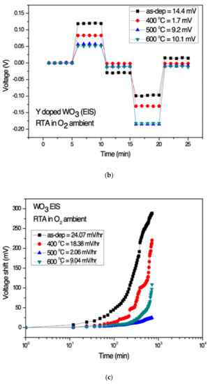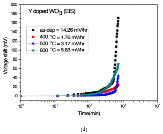 Moreover, the drift voltage is an indicator for analyzing the long-term stability of the device. We can use the model of gate voltage drift of pH-ISFET to describe the hopping or trap-limited transport mechanism and the realization of dispersive transport [40]. All the measurements are performed at room temperature with pH = 7. The configuration is shown in Figure 1b. The C–V curves of the drift effect of the WO3 sensing film and Y-doped WO3 are measured in a pH 7 buffer solution for 12 h, as shown in Figure 6c,d. The drift rate values of the WO3 samples for the as-deposited and the samples with RTA temperatures of 400, 500, and 600 °C are 24.07, 18.38, 2.06, and 9.04 mV/hr, respectively. Further, the drift rate values of the Y-doped WO3 samples for the as-deposited sample and the samples with RTA temperatures of 400, 500, and 600 °C are 14.26, 1.76, 3.71, and 5.83 mV/hr, respectively. Results indicate that Y doping and annealing can eliminate the trapping states in membrane capacitance as shown in Equations (1)–(3) enhance device reliability.