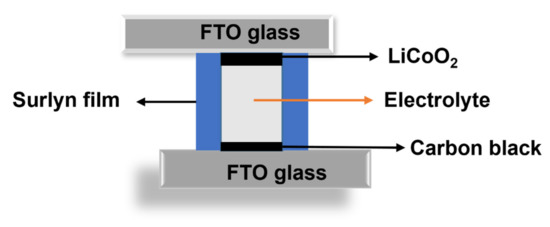 An asymmetric dummy cell was assembled for evaluating the conductivity of the as-synthesized electrolytes, and its configuration is shown in Figure 1. Typically, for cathode electrodes, the composition of slurry paste was LCO (86 wt%), CB (5 wt%), and PVDF (9 wt%). The LiCoO2-coated electrode was prepared by doctor-blading a home-made paste on a clean FTO glass electrode (active area: ca. 0.138 cm2; thickness: ca. 10 μm) and dried at 80 °C overnight in a vacuum oven. Similarly, a graphite anode electrode was also fabricated on a cleaned FTO glass electrode (active area: ca. 0.138 cm2; thickness: ca.12 μm) using a homemade paste consisting of carbon black and PVDF of 90 and 10 wt%, respectively.