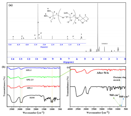 Figure 2. (a) 1H-NMR spectra (inset shows the partial enlarged 1H-NMR spectra) of SPE-2.5, (b) FTIR spectra of precursor EOM and SPEs and (c) initial transmittance and after 54 h of SPE-2.5.
