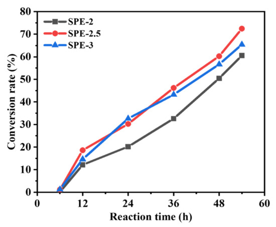 Figure 3. Conversion rate vs. reaction time plots of SPE-2, SPE-2.5, and SPE-3.