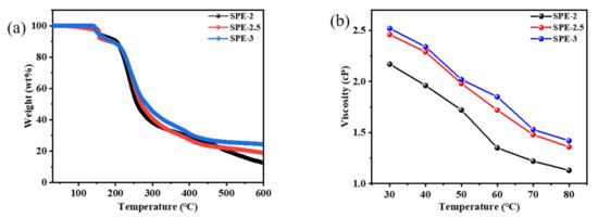 Figure 4. TGA traces (a) and viscosity vs. temperature curves (b) of SPE-2, SPE-2.5, and SPE-3.