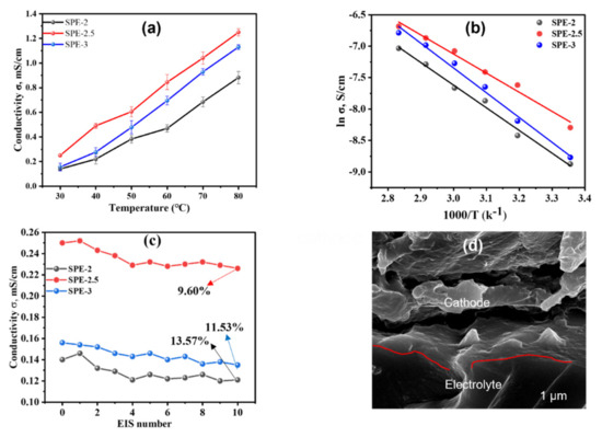 Figure 5. Plots of conductivity vs. temperature (a) and ln (Li+ conductivity) vs. the inverse of absolute temperature (b) of SPEs. (c) Variation of the conductivity of SPEs with repetitive EIS scanning for SPE-2, SPE-2.5, and SPE-3, at 25 °C and open circuit condition. (d) Cross-sectional FE-SEM image after 50 cycles from dummy cell of SPE-2.5.