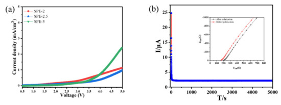 Figure 6. (a) Current density vs. voltage plot of SPE-2, SPE-2.5, and SPE-3. (b) Chronoamperometric polarization plot of the electrolyte-based symmetry Li/SPE-2.5/Li Swagelok cell at 10 mV for 5000 s (inset exhibits the Nyquist curves of the cell before and after polarization).
