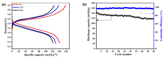 Figure 7a demonstrates the CD profiles of LiFePO4/SPE-2.5/Li at 1st, 25th, and 50th cycle numbers over the potential range of 2.5–4.2 V at 0.1 C. The discharge specific capacities of SPE-2.5 containing the half-cell after 1st, 25th, and 50th cycles were ca. 141, 129, and 120 mAh/g, respectively. At the same time, the corresponding charge specific capacities of this electrolyte were ca. 157, 137, and 125 mAh/g, respectively. Figure 7b exhibits the variation of Csp and η with the number of CD cycles at 0.1 C. The Csp of SPE-2.5 electrolyte-based half-cell was ca. 120 mAh/g at 0.1 C after 50 CD cycles, which retained 85.11% of initial Csp. This could be ascribed to the effect of LiFePO4 cathode material thickness (our LiFePO4 thickness was ca. 55 μm) during the in situ polymerization process [32]. In addition, the η of the half-cell was ca. 95.25% after 50 CD cycles, indicating that there was a highly reversible positive electrochemical reaction. Over 2 M LiFSI in electrolytes probably generates solid electrolyte layers, which facilitate cycling performances of Li metal anode [33]. Thereof, these results suggest that SPE-2.5 electrolyte is promising for the development of Li-ion batteries.