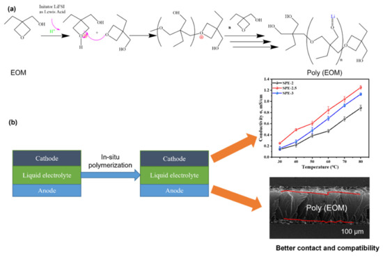 According to our experimental results, a plausible self-catalyzed cationic ring-opening polymerization mechanism (Figure 8a) and merits of in situ polymerization (Figure 8b) were presented. Due to the absence of an inflammable solvent, as-prepared SPEs could improve the safety performance of batteries. Ionic conductivity was observed to be better in SPE-2.5 than in SPE-2 and SPE-3, suggesting that abundant OH groups and highly concentrated Li salt affected the Li+ ion mobility in poly (EOM). Additionally, SPE-2.5 demonstrated a comparable Csp and η, which could be applied in Li-ion batteries.