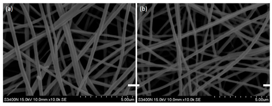 The electrospinning device used in this study was supplied by Falco Tech Enterprise Co., Ltd. (Taoyuan, Taiwan). The assembly and operation of the electrospinning device was in accordance with the procedures described in a previous study [20,29], and the setup of the device is illustrated in Figure 1. During electrospinning, the humidity was approximately 65–70%. The electrospinning process was performed at 25 °C by ejecting the polymer solution via a nozzle tip to an electrostatic collector pre-immobilized with PET, which serves as a supporting layer of nanofiber membrane. Lastly, the heat pressing of the electrospun nanofiber membranes was conducted at 100 °C for 1 h and the pressure used for the heat pressing was 1 MPa. The morphology of the nanofiber membrane was examined using a SEM (Hitachi, Model S-2600H/EDX, Tokyo, Japan). Before SEM examination, all samples were sputter-coated with platinum. The chemical properties of nanofiber membranes were characterized using a FTIR spectrometer (Perkin Elmer, Model Spectrum One, NY, USA) with a resolution of 1 cm−1 in a wavenumber range of 4000–400 cm−1.