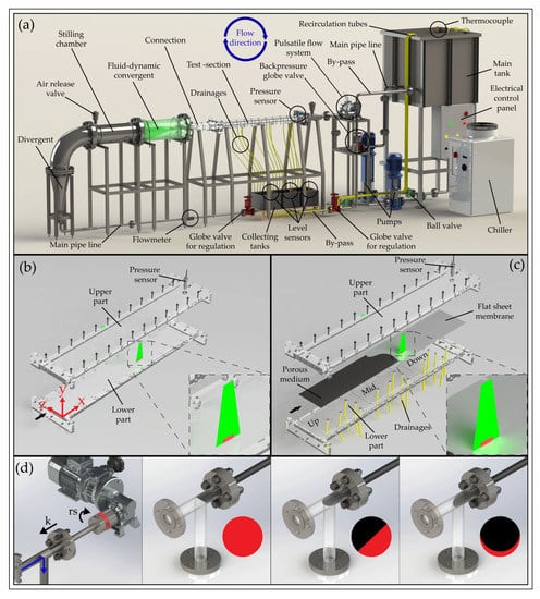 Their emptying is regulated automatically by ultrasonic level sensors that control the on/off sequences of the bilge pumps. The filtrate then returns, via recirculation tubes, to the main tank to maintain a constant water volume in the whole system. The overhead tank is equipped with a thermocouple that allows for the monitoring of water temperature. An ultrasonic flow meter is mounted on the main line and a pressure sensor at the end of the test section. These were chosen with an appropriate level of accuracy, namely, 2% for u > 0.3 m/s for the AcquaTrans™ AT600 flow meter manufactured by Panametrics, and 0.008 bar for the Wika P-30 pressure sensor. Flow rate and pressure data, acquired at whatever desired frequency, are transmitted with a 4–20 mA signal to a National Instruments data acquisition card by means of a Labview program. To avoid changes in water density and in membrane hydraulic conductivity, temperature is kept constant by means of a 5 kW chiller. For a better and more detailed understanding of the overall system operation, reference should be made to the “Piping and instrumentation diagram” (P&ID) available in Figure S1 of the Supplementary Material.