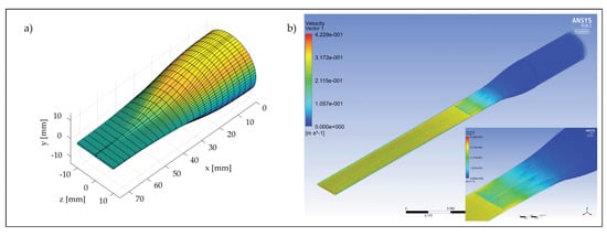 (a) Geometry of the convergent section and (b) result of a CFD simulation performed inside the fluid-dynamic convergent, connection and test section.