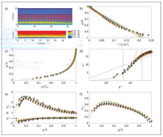 Velocity statistics obtained from PIV measurements in the lower half of the test section for three different streamwise positions; h is the channel semi-height, u/u* is the normalized velocity; = y u*/ is the normalized distance from the wall, Um is the maximum speed, /u* and /u* are the non-dimensional root squares of the variance for wall-normal and longitudinal velocity fluctuations, respectively, and /u* is the non-dimensional root square of the covariance. (a) Flow field and contour plot for test F-1; (b) total shear stress for all tests; (c) non-dimensional mean-velocity profiles (outer scaling); (d) non-dimensional mean-velocity profiles (inner scaling), the dashed line represent the linear law u = y, characterizing wall flows for (see e.g., Pope (2000) [30]); (e,f) non-dimensional profiles of velocity variances. Symbols and experimental conditions for all the tests are reported in Table 1, with the exception for ◇ that refers to the data from the DNS by Tsukara (2005).