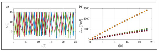 Results of S-4_1.5 filtration test with a feed pressure of 1.5 bar; (a) fill levels of the three filtrate collection tanks vs. time; (b) total water flux and flux measured from the individual portions. In both panels, blue, green and red lines/symbols refer to, up, mid and down collection tanks, respectively (see Figure 1). Orange squares in panel (b) refer to the cumulative flux.