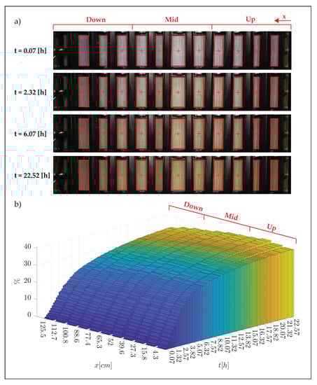 Here, panel (a) reports examples of the images taken over different time steps (note that full optical access to the surface of the membrane is prevented due to the presence of braces that were used to avoid water leakage), while panel (b) shows the variation in yellow band color as detected by the camera over the 11 boxes highlighted in red in panel (a).