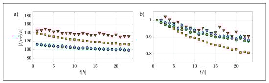 Dimensional (panel (a)) and non-dimensional (panel (b)) filtrate fluxes vs. time for all experimental conditions (symbols as indicated in Table 2). In Panel (b), filtrate fluxes are normalized by their initial value.