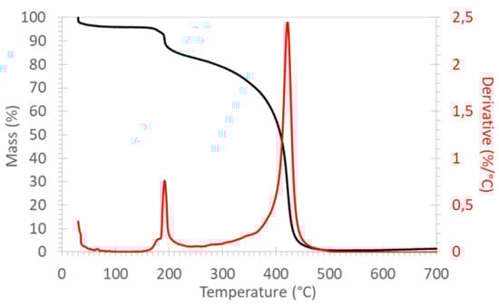 The high-resolution thermogravimetric analysis was performed with a TA Q500 apparatus (TA instruments, New Castle, DE, USA). The experiments were executed between 30–700 °C in air with a maximum heating rate of 3 K/min.