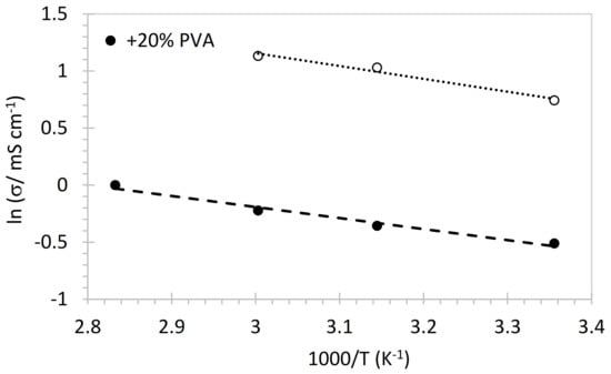 The activation energy (0.08 eV with PVA and 0.10 eV with PVDF) is compatible with ion conduction in aqueous solution, indicating that PVA and PVDF participate in the ionic transport. Similar activation energies were reported for PVA-based gel polymer electrolytes with KOH [] and quaternized PVA []. The activation energies for PVDF-based AEM in the literature are generally somewhat higher, indicating here a particularly favored pathway for ion conduction that might be related to an improved nanophase separation by the presence of hydrophobic PVDF [].