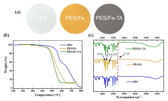 The fabrication process of LNM combined blending and interfacial coordination strategy was depicted in Figure 2. For the control, the pristine PES membrane was also fabricated using the NIPS technique. The photographs of the PES, PES/Fe and PES/Fe-TA membrane are shown in Figure 3a. It can be observed that the pristine PES membrane shows a white color and the PES/Fe membrane exhibits an orange color. The color change is ascribed to the color of iron acetylacetonate, suggesting the successful incorporation of Fe3+ on the membrane matrix. After the immersion of TA solution, the PES/Fe-TA membrane displays dark grey, demonstrating the TA coating is assembled on the membrane surface. In order to further confirm the existence of Fe and TA on PES membrane, the TGA and FTIR analysis were studied. Figure 3b exhibits the results of TGA analysis for the PES, PES/Fe and PES/Fe-TA membrane. The residual weights of PES/Fe and PES/Fe-TA membrane were 9.8% and 10.2%, while the pristine PES membrane was completely burned out in the air atmosphere. The increase of residual mass should correspond to the iron base compound in the PES/Fe and PES/Fe-TA membranes, providing further evidence of the iron complex loading. FT-IR was employed to analyze the surface chemical structure of PES, PES/Fe and PES/Fe-TA membranes, as shown in Figure 3c. The absorption peaks at 1150 cm−1 and 1296 cm−1 are the symmetric and asymmetric stretching vibrational peaks of the S=O functional group in PES. The stretching vibration peak between benzene ring and S in PES is located at 1100 cm−1. Compared with the PES and PES/Fe membrane, an additional adsorption band at 1720 cm−1 can be observed in the spectrum of the PES/Fe-TA membrane. This can be ascribed to the C=O stretching vibrations of the of TA [], suggesting that the TA were successfully incorporated on PES/Fe membrane surface.