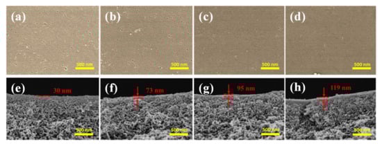 The cross-section images in Figure 5e–h show that a top layer formed on the PES/Fe support after TA assembly. Moreover, the thickness of the top layer increased from ~30 nm to 119 nm with the increase of the TA assembly time. The Fe3+ migrated to the membrane surface and coordinated with TA to form the thicker separation layer with the increase of the TA assembly time. Therefore, the interfacial coordination of polyphenolic layer can form a smooth surface and controllable thickness of separation layer by varying the TA assembly time, which might decide the separation performance of the membrane.