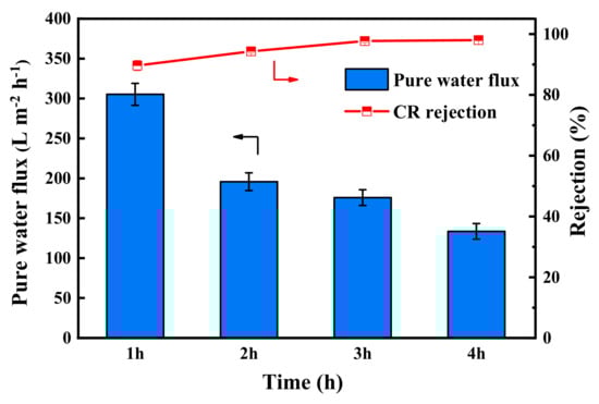 The pure water flux and CR rejection of PES/Fe-TA membranes with different TA assembly times is shown in Figure 6. It can be seen that the pure water permeance of the PES/Fe-TA membrane gradually decreased, while the rejections of CR increased with the increase of assembly time. The water permeance decreased from 305.2 L·m−2·h−1 to 133.6 L·m−2·h−1, and the CR rejection increased from 89.7% to 98.1%. These results could be attributed to the fact that a thicker separation layer was formed on the membrane surface with the increase of TA assembly time, leading to the smaller pore size and increased permeation resistance, as shown in Figure 5. Comprehensively considering the water flux and rejection, the assembly time was fixed to 3 h for the following tests. For the PES/Fe-TA3h membrane, the water permeance reached 175.8 L·m−2·h−1 and the rejection rate of CR was 97.7% at 0.2 MPa.