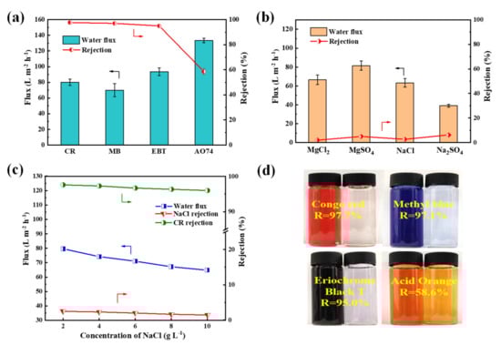 It is believed that the presence of salt in the dye solution has some effects on the membrane separation performance; therefore, the separation properties of dye and salt mixture was investigated. The 0.1 g/L CR with different NaCl content were used to form different salinity feed solution. The results of permeate flux and solute rejections for the CR/NaCl mixture are shown in Figure 7c. It can be seen that the permeability of CR/NaCl mixture solution decreased from 79.6 L·m−2·h−1 to 64.8 L·m−2·h−1. Moreover, the rejections of CR and NaCl also decreased, from 97.6% to 96.0% and from 2.5% to 1.45% respectively, with the increase of NaCl concentration (from 2 g/L to 10 g/L). This was because salt tends to disperse dye molecules uniformly in the mixed solution and avoid the aggregation of dye molecules, resulting in smaller dye particles to permeate through the membrane pores. Meanwhile, the dye adsorbed on the membrane pores and the concentration polarization occurred on the membrane surface, which resulted in decreased permeability and dye rejection.