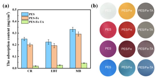 The dye adsorption content (a) and digital photos of surface color (b) on PES, PES/Fe and PES/Fe-TA3h membranes with static adsorption for different dyes.