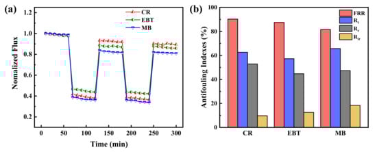 In order to further evaluate the antifouling property of PES/Fe-TA membrane, the dynamic cyclic filtration experiment with different dye solutions was conducted and the results are revealed in Figure 9a. It can be seen that the permeate flux of the dye solution are lower than the pure water. This is probably caused by the dye fouling and concentration polarization. Moreover, the water flux recovers by the water/ethanol dilute solution cleaning treatment after each cycle of dye filtration test. In addition, the values of Jw1, Jp and Jw2 measured in the two cycles were used to calculate FRR, Rt, Rr and Rir to evaluate the anti-fouling properties of the PES/Fe-TA membrane, as shown in Figure 9b. After two cycles, the FRR values of CR, EBT and MB were 90.3%, 87.5% and 81.6%, respectively, and the corresponding Rt values were 62.6%, 57.3% and 65.7%, respectively. It shows that the PES/Fe-TA3h membrane has excellent antifouling property on CR, EBT and MB. Based on the above results, the excellent antifouling ability of PES/Fe-TA3h membrane promotes its further application in dye desalination and dye wastewater treatment. These results clearly indicated that TA, indeed, acted as a strong dye adsorption resistance.