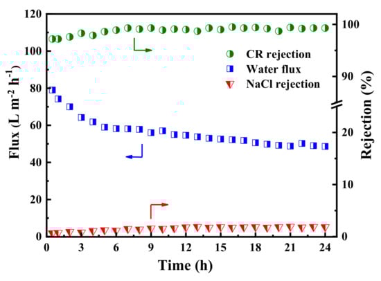 To evaluate the long-term stability of optimized NF membranes, the CR (0.1 g/L) solutions mixed with NaCl (2 g/L) were used as feed solution to filtrated for 24 h. The permeate flux and rejections for CR and NaCl were monitored by the aforementioned methods.