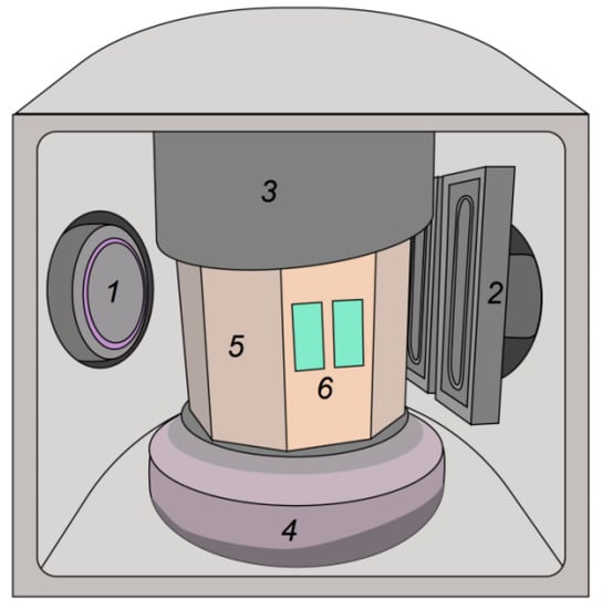 Film deposition facility: 1—anode-layer ion source, 2—dual magnetrons, 3—shield, 4—rotating table, 5—drum with heaters, 6—anode substrates.