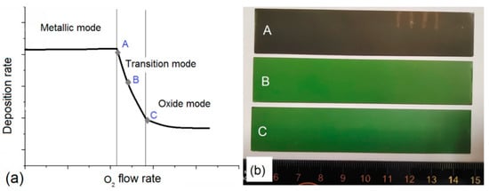 Three modes used for the YSZ electrolyte film deposition differ by the oxygen concentration in the vacuum chamber and, consequently, the deposition rate. Figure 2 presents the typical dependence between the rates of the oxide-film deposition and the oxygen gas flow; each mode is indicated by letters A, B, and C [35]. At A point of the transition mode observed near the metallic mode, the deposition rate is the highest (35–45 nm/min), whereas the oxygen concentration is the lowest. The latter is manifested in the low electrolyte film transparency in the visible region (see Figure 2b). At B point observed at the center of the transition mode, the deposition rate is 16–25 nm/min, and a slight oxygen deficiency, which is proven by the high electrolyte film transparency. At C point of the oxide mode, the deposition rate is the lowest (6 or 7 nm/min), its composition being close to the stoichiometry.