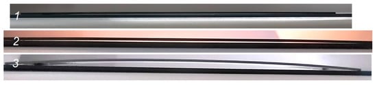Table 1 contains deposition process parameters and residual stress values for the YSZ electrolyte film deposition. Films 1–3 are obtained at 0.4 Pa pressure at A, B, C points indicated in Figure 2a. After the YSZ electrolyte film deposition, all half-cells warp toward the electrolyte side, as shown in Figure 4. This proves the presence of residual compressive stresses common to sputter-deposited oxide films [39]. In the electrolyte films fabricated in the transition mode, i.e., with the oxygen deficiency, moderate stresses of 670–690 MPa are detected. In the oxide mode, these stresses are significantly higher (1780 MPa).