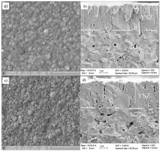 The surface of the YSZ film deposited at a small oxygen deficiency (Figure 6c) consists of polygonal grains with rounded edges, which are loosely adjacent to each other. The section in Figure 6d shows a lot of closed pores, which are larger than those observed in Figure 2b.
