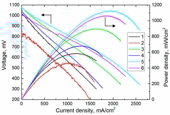 The SOFC evenness remaining after the YSZ film deposition is the important requirement. It is also important to retain the gas impermeability for the electrolyte layer. Therefore, we compare the volt-ampere characteristics of SOFCs fabricated from the YSZ electrolyte films 1–6 subjected to annealing and given in Table 1 and Figure 7. The results obtained at 800 °C are summarized in Table 2; hydrogen and air are fuel and oxidizing medium, respectively.