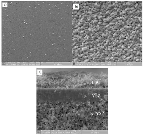 In Figure 8a,b, one can see the surface morphology of the YSZ film for SOFC 5 after 1200 °C dead-load annealing. The film surface is dense and after annealing, it is not cracked. This surface consists of submicron triangular grains with faceted sharp edges. The cross-sectional SEM image in Figure 8c shows the dense and uniform structure.