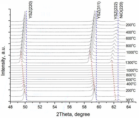 Figure 9 shows in situ XRD patterns for film 2 obtained during annealing in air and cooling to room temperature. The as-deposited YSZ electrolyte film displays the typical diffraction pattern of cubic Y0.16Zr0.84O1.92 (ICDD PDF database file number 04-001-9395). The diffraction peaks of 50.2, 59.6, and 62.6 degrees 2θ unambiguously assign the cubic phase corresponding to (220), (311), and (222) planes, respectively. The XRD pattern of tetragonal zirconia demonstrates peak splitting at around 60 degrees 2θ [47]. As compared to the stress-free film, the shift in the peak position indicates that this film is under residual compressive stress. During heating up to 1300 °C in air, the YSZ diffraction peaks gradually shift to the left due to the thermal expansion of the crystal lattice. In these conditions, the decrease in the peak intensity is explained by the drift of the SR beam during the process of measurement. After heating up to 1300 °C, the monochromator is corrected, and the peak intensity increases up to its initial value.