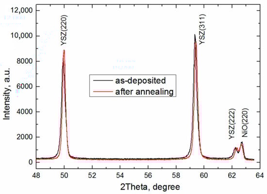 In the film cooling, the diffraction peaks move smoothly back in their initial position. The peak shift in X-ray diffraction of the YSZ film (film 2) before (black) and after (red) 1300 °C annealing in air is presented in Figure 10. After annealing and cooling to room temperature, the peaks slightly shift toward larger angles due to a decrease in the lattice parameter caused by annealing. This indicates that the residual compressive stress amplitude reduces in the film, which is held in agreement with the experimental data summarized in Table 1. After annealing, the peak width decreases indicating the growth in the coherent scattering region in the film, namely ~55–60 nm. After the thermal annealing, the (220) peak intensity increases and the (311) peak intensity lowers. The peak intensity ratio (220)/(311) after 1300 °C annealing grows from 0.92 to 1.02 and is about 1.62 for the unstressed state according to 04-001-9395 ICDD PDF database file number.